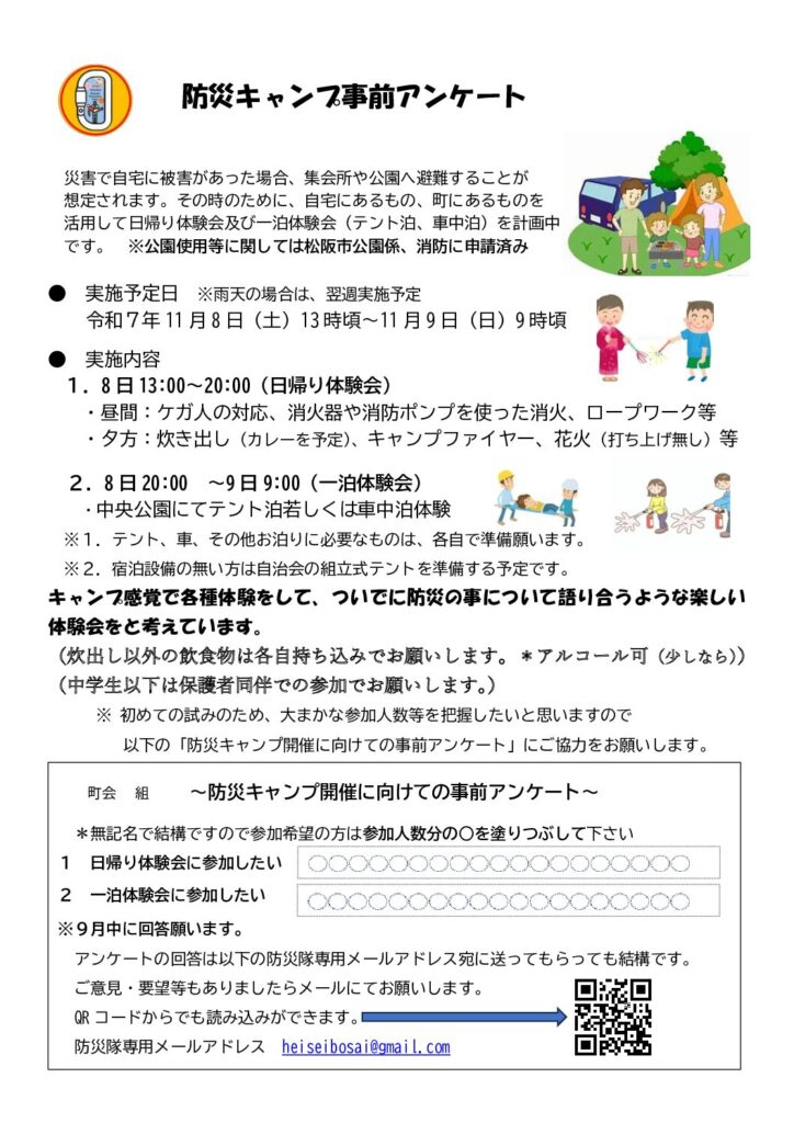 2025.09.16 美花隊・防災隊だより R7.9 防災キャンプ事前アンケート この記事のタイトルとURLをコピーする Post Share RSS Pin it この記事のタイトルとURLをコピーする R7.9 自主防災隊だより 前の記事 R7年10月 回覧&広報! 次の記事