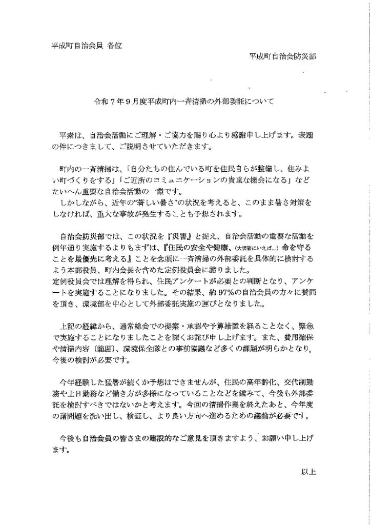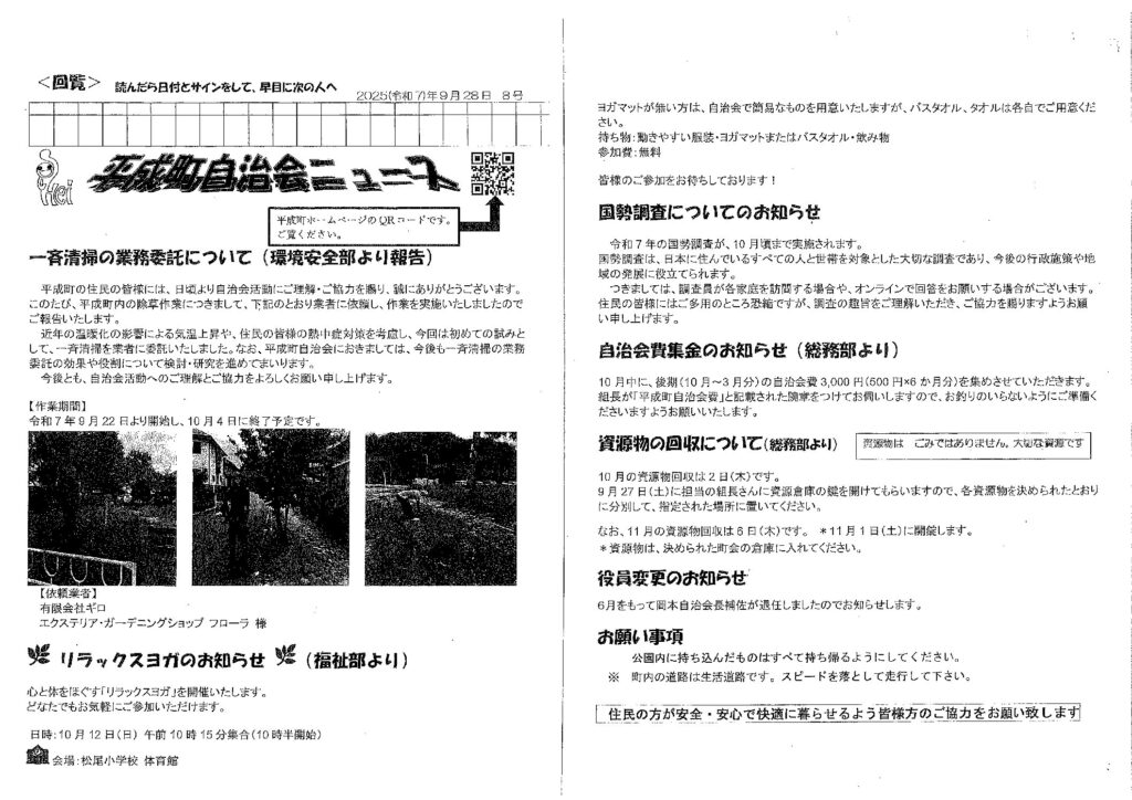 2025.09.28 平成町自治会ニュース R7年10月 回覧&広報! この記事のタイトルとURLをコピーする Post Share RSS Pin it この記事のタイトルとURLをコピーする R7.9 防災キャンプ事前アンケート 前の記事 R7.10 自主防災隊だより 次の記事