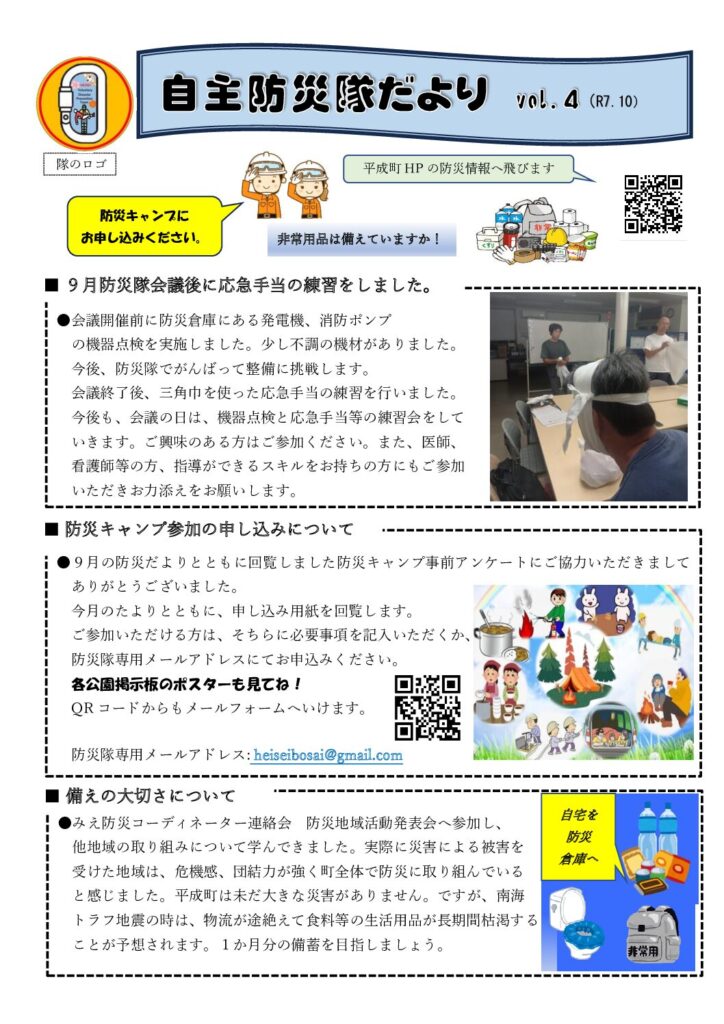 2025.10.20 美花隊・防災隊だより R7.10 自主防災隊だより この記事のタイトルとURLをコピーする Post Share RSS Pin it この記事のタイトルとURLをコピーする R7年10月 回覧&広報! 前の記事 平成町防災キャンプ開催案内 次の記事