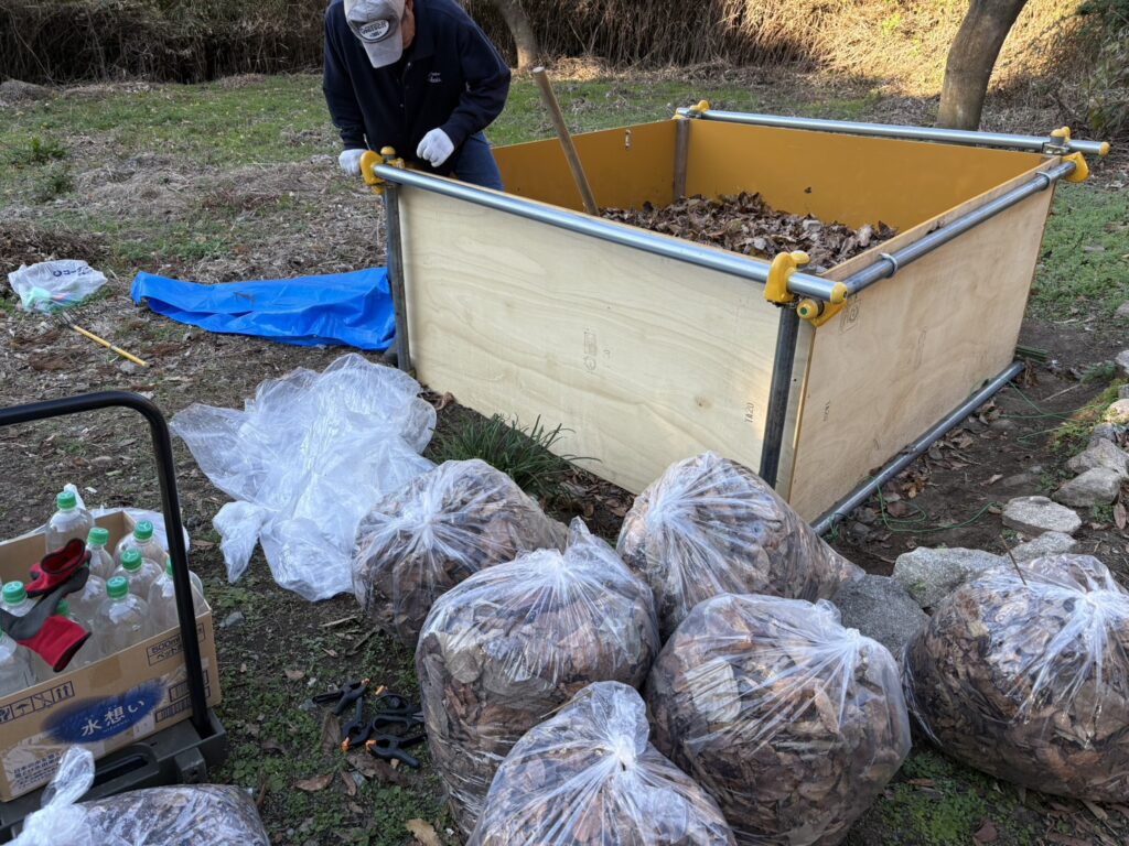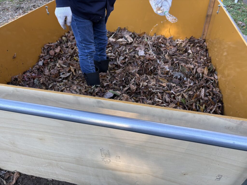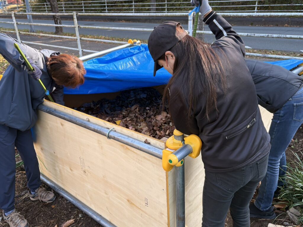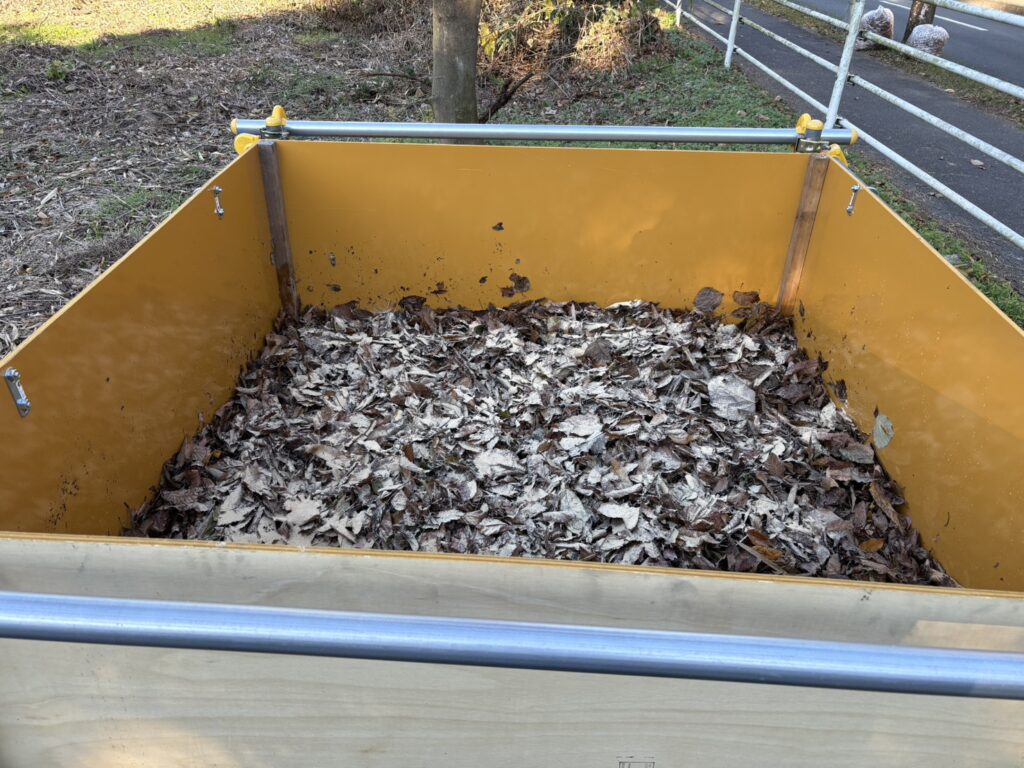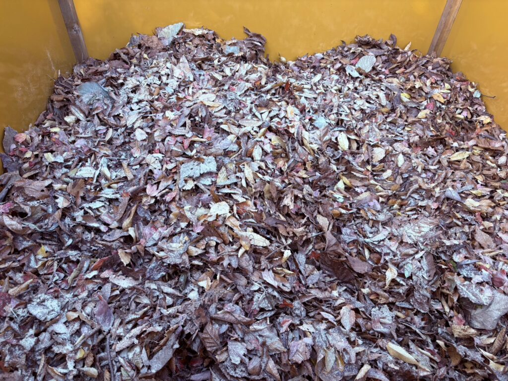 美花隊では、この冬から町の落ち葉を活かした腐葉土づくりに取り組んでいます。集めた落ち葉に米ぬかと水を加えて発酵させ、定期的に撹拌しながら、春まで時間をかけてじっくり熟成させていきます。
